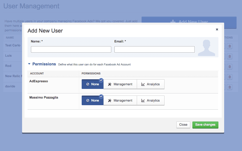 You can add employees, coworkers or even clients to your AdEspresso account – once added, you can choose to grant them either analytics or management permission to each of your Ad Accounts.