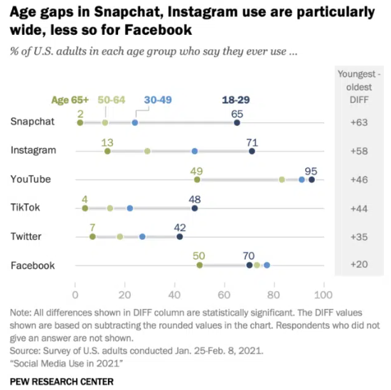 Snapchat is popularly used amongst younger audiences, but it has the largest age gap out of any social media platform (more info below). This means that both young and old people alike love to snap.