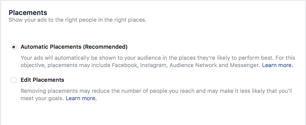 Facebook will automatically have most placements selected. If you want to change them, you need to select “Edit Placements.”