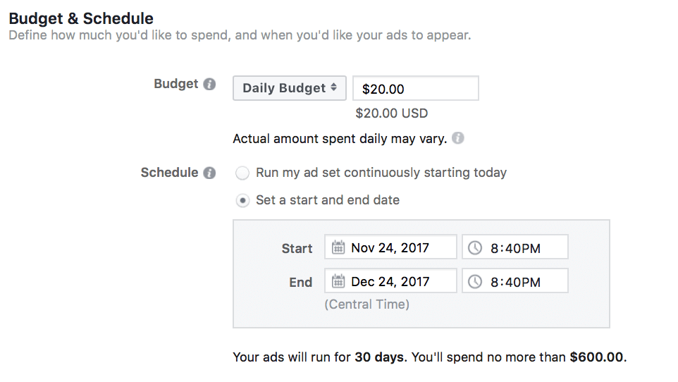 Next, you can choose to run your ad set continuously, or schedule a start and end date. Setting an end date ensures that you’ll never have a campaign that gets forgotten, and you can always extend the end date at a later time.