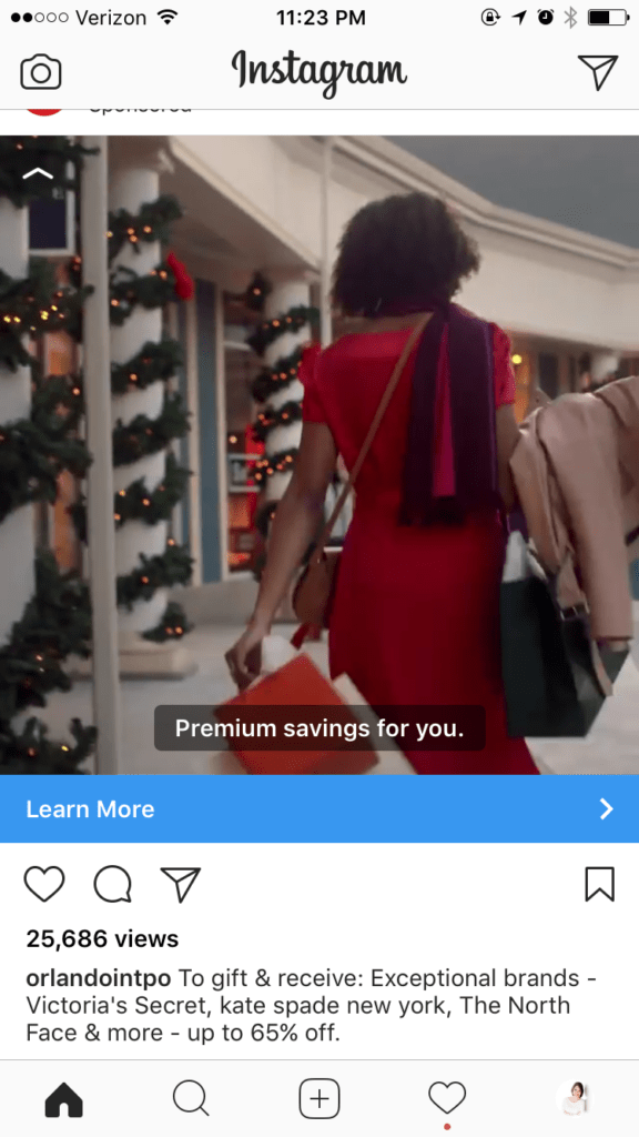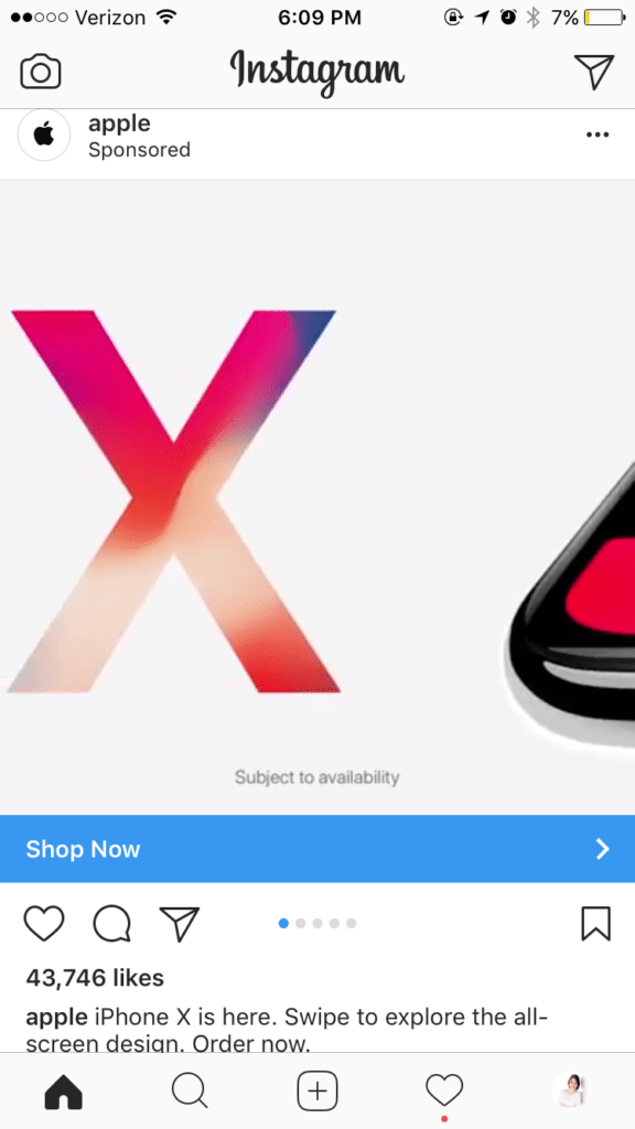 Multiple image formats can be a dynamic way to showcase several products (or a single product up close, like the example below, that had customers swipe to view the full iPhone X). It gives you more visual space to elaborate on the point you’re trying to make. You can also add videos to one or more slides in your carousel to make them even more engaging. These images and videos should be square instead of rectangular. Encouraging users to Swipe is beneficial for these ads, as they aren’t as obvious on Instagram as they are on Facebook.