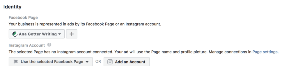 Connecting your Instagram Ad account to Facebook is quick and easy. Once in the Ad creation, you’ll be given the option to choose which Page and Instagram account you want to run the campaigns under. Your Facebook Page will likely be hooked up. If you haven’t connected your Instagram account yet, it will look something like this: