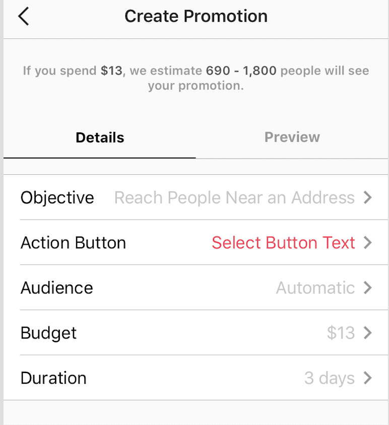 On the next screen, you’ll choose your CTA, set your budget, and establish how long you want your campaign to run. Make sure you preview your ad before submitting it to run.