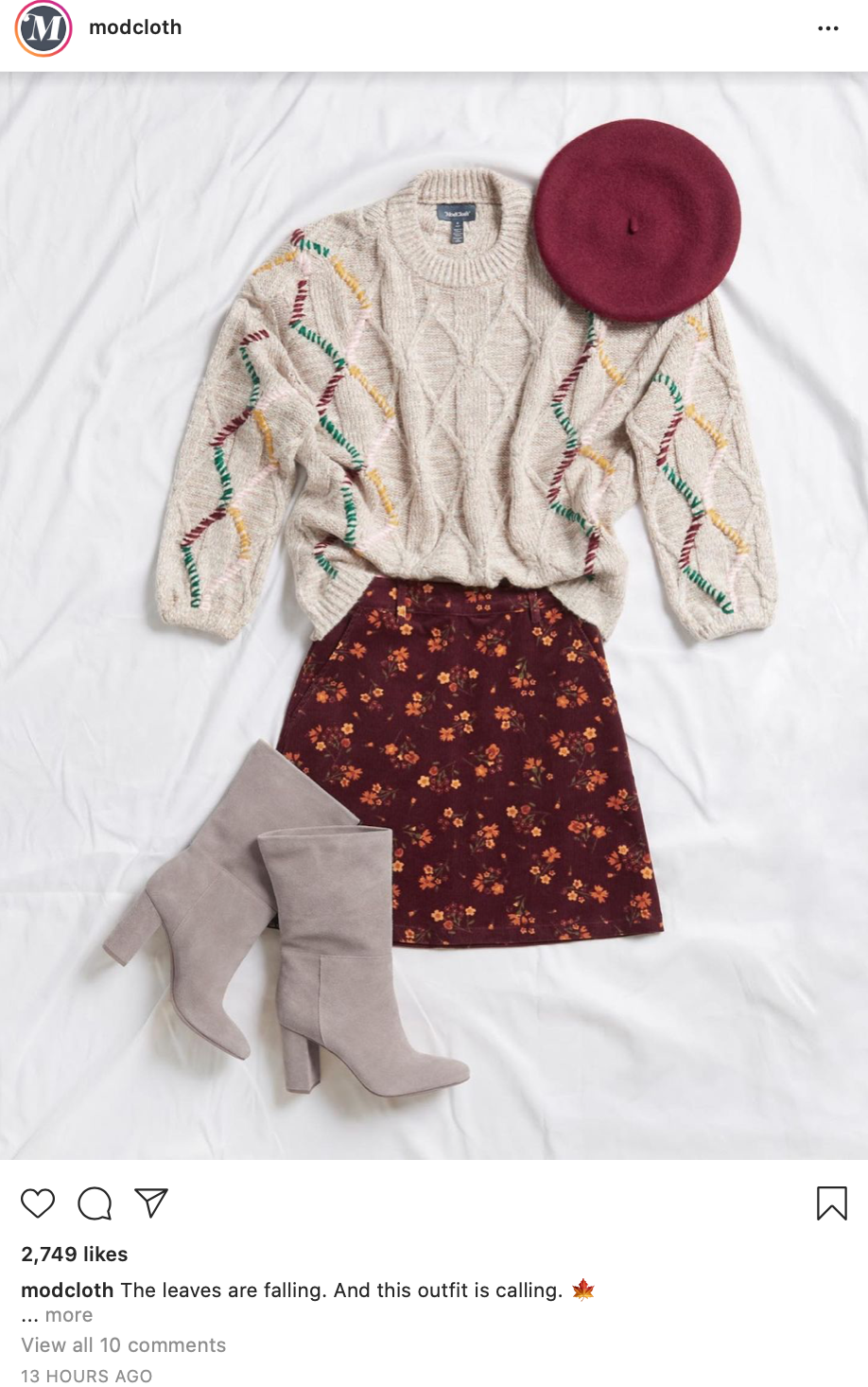 The example below is a simple one. It’s fall right now, the season of pumpkin spice, boots and sweaters. Modcloth used the caption “The leaves are falling. And this outfit is calling.” It perfectly captures the fall aesthetic they want their audience to enjoy. The timely reference to leaves falling is cute, and it can engage users in a conversation about autumn style.