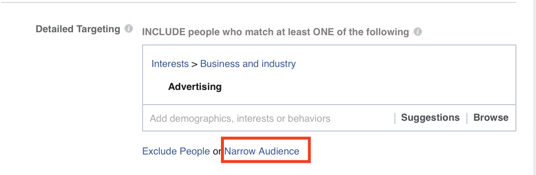 You can optimize your Facebook audiences by clicking on the “Narrow Audience” button under the Interests section.
