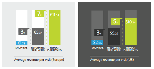 According to Adobe, in the US 41% of overall revenue comes from repeat customers. Moreover, the average revenue per visit for repeat buyers is 497% higher compared to regular shoppers.