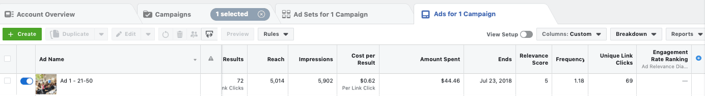 Once that’s done, just go to your Facebook Ads Manager, select a campaign and then an Ad Set. In the “Ads” tab, you’ll get a list of ads, each of which will have its own Relevance Score and Diagnostics.