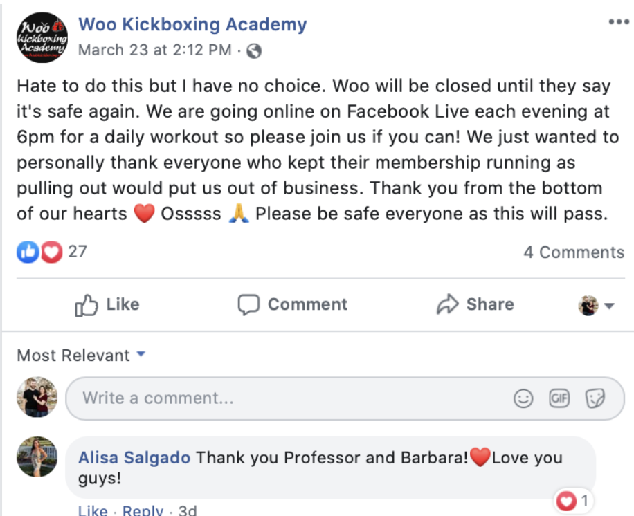 My kickboxing studio Woo Kickboxing had to share one of these announcements recently, informing students they’d be closing up shop and reminding them to tune in for an online daily workout.
