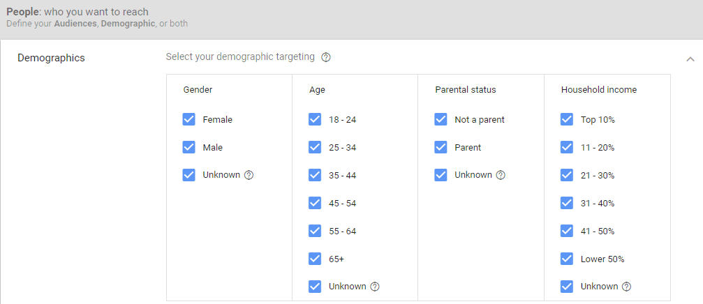 Start by selecting common demographics from age to gender, parental status and even household income: