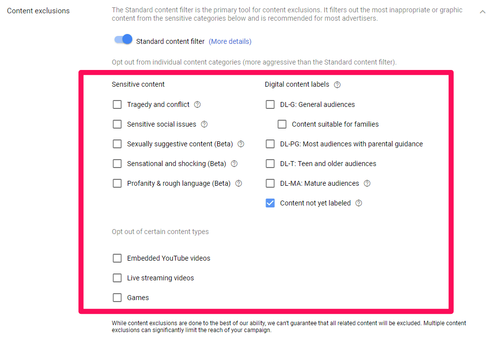 Content exclusion helps you filter out potentially negative or sensitive videos that could reflect poorly on your brand or message.