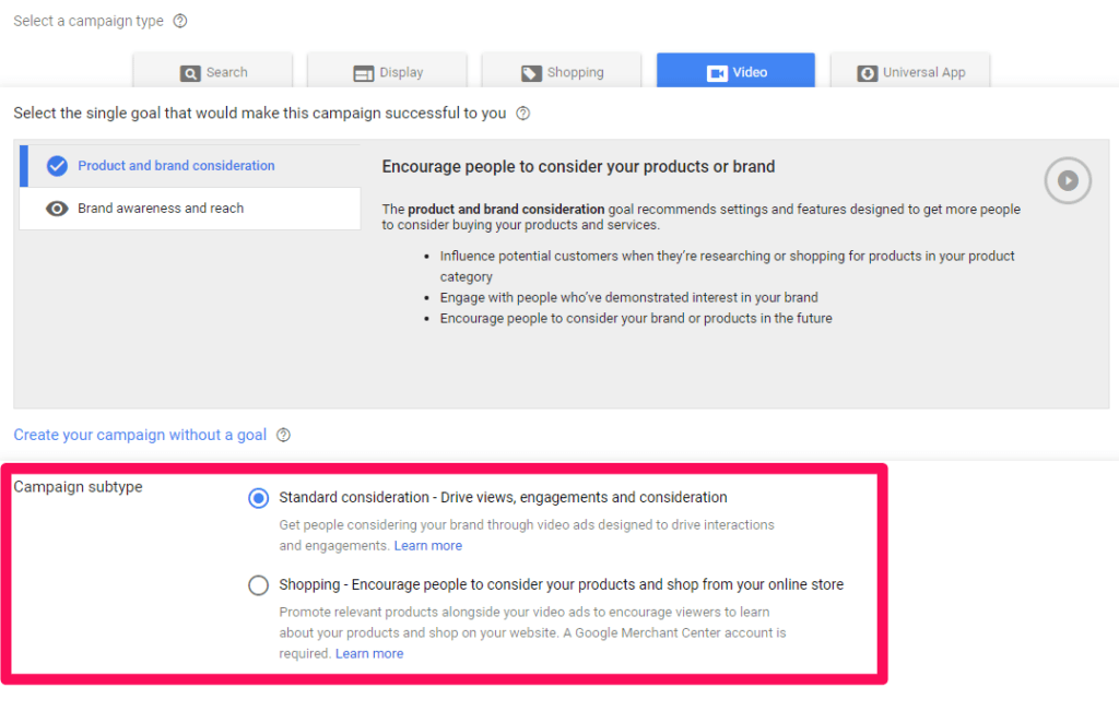 Specific goals, like integrating e-commerce and Google Shopping only work using the in-stream ad format.