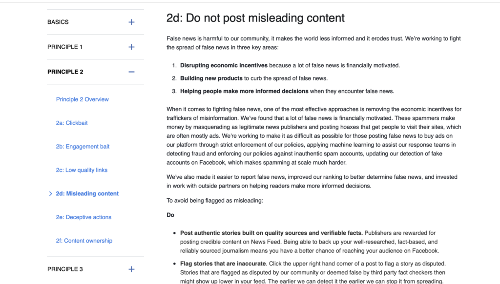 Facebook’s guidelines state that companies shouldn’t be using click-bait to drive engagement, and that they shouldn’t be sharing misleading information.