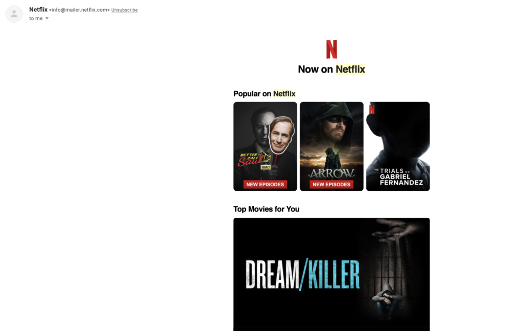 Netflix regularly uses email marketing to send out personalized suggestions based on each users’ past watch history, reminding them to finish shows before they’re taken off the platform or offering ideas of new content to watch. This is extremely effective.