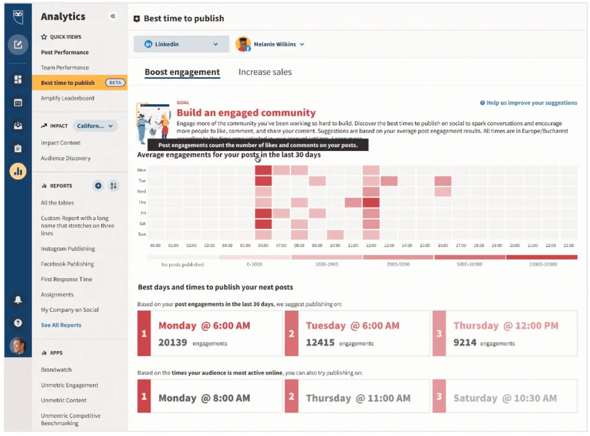 You can go a step further and pin down your own custom best time to post. Hootsuite’s Best Time to Publish feature analyzes your past performance to show you data for the best times to post on each of your social platforms.